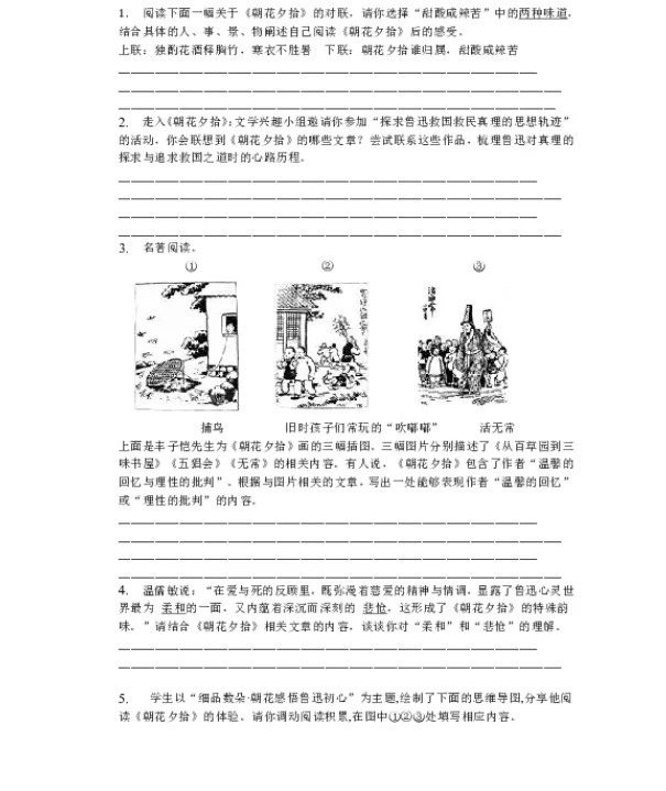 从小学课本上,我们第一次接触到鲁迅先生的《少年闰土》起,就注定走上了一条“迅化”的不归路。因为在学习的鲁迅作品,大多都是轻松类的回忆童年,例如《少年闰土》;考题也大多是“按课文填空”、“缩句”“模仿写作手法”一类,孩子们做起题来也都得心应手。可到了初中,他来了!他来了!鲁迅先生“成群结队”地带着“深刻内涵”来了!《从百草园到三味书屋》《故乡》《孔乙己》《阿长和<山海经>》《藤野先生》......上面这些都是各版初中教材的鲁迅的必学文章,令孩子们连连叫苦:别人的文章总是两到三天就能学完,可鲁迅的一般都要学一周多!从作者简介到文章背景,从正文到注释,有时甚至连标点的运用,都要掰开来揉碎了细细讲细细品!还有,为什么几乎他的每一篇文章,都有重点段落要背诵!
